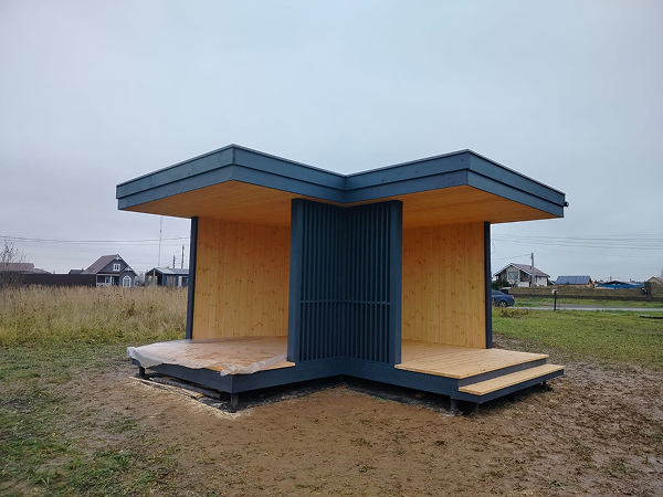 Просторная летняя беседка «Хай-тек» гармонично впишется в любой ландшафт благодаря минималистичному дизайну. Простота конструкции, прямые линии, больше пространства и света, меньше деталей — такая философия современной архитектуры привлекает все больше владельцев загородных домов. Две стены полностью глухие, в поворотной части имеется ограждение из вертикальных досок. По одной из сторон предусмотрено место для печи, что делает беседку функциональной в любое время года.