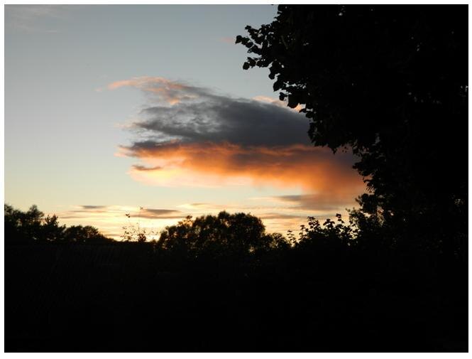 Осенний вечер в деревне ознаменовался необычно красивой зарёй. Солнечные лучи подсветили дождевые струи из тучи, уходящей на северо-восток. Дед Санай полюбовался картиной уходящего дня, вскипятил чайник и почаёвничал с конфеткой.