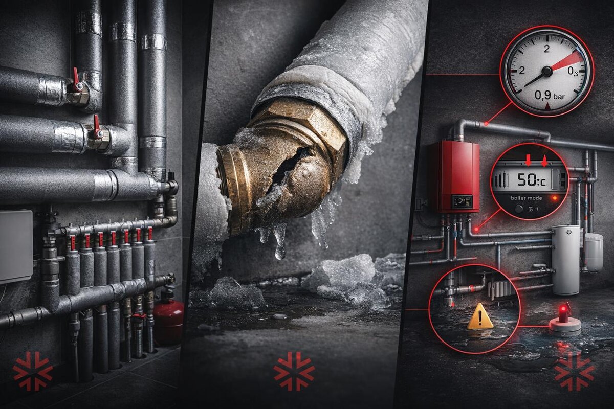 Зимой инженерные системы работают в режиме максимальной нагрузки. И именно в этот период любая утечка становится критичной — из-за температуры, непрерывной работы котла и сложности быстрого ремонта. Важно понимать: в большинстве случаев аварии не происходят внезапно. Им почти всегда предшествуют признаки, которые можно заметить заранее. По практике эксплуатации частных домов основные зоны риска — одни и те же: Со временем уплотнения теряют эластичность. Зимой это проявляется быстрее из-за температурных циклов и вибраций от работы насосов. 2. Узлы возле котла и коллекторов Здесь максимальная температура, объемные расширения и количество соединений. Даже корректно смонтированные системы со временем требуют ревизии. 3. Участки в холодных зонах Гаражи, вводы труб через стены, неотапливаемые техпомещения. Переохлаждение приводит к локальным повреждениям или ослаблению соединений. 4. Системы старше 7–10 лет Внешне они могут выглядеть исправными, но ресурс проклад