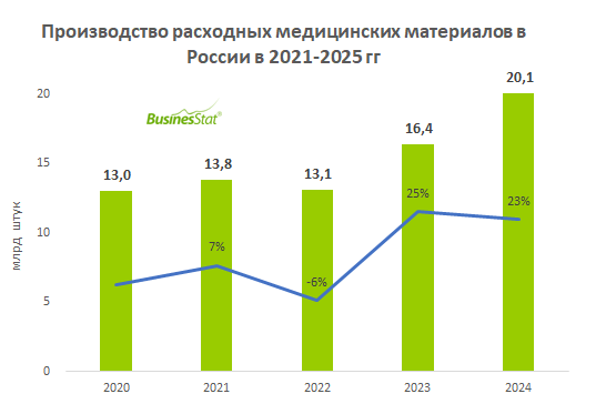 В 2025 г производство расходных медицинских материалов в России выросло на 23% до 20 млрд шт.