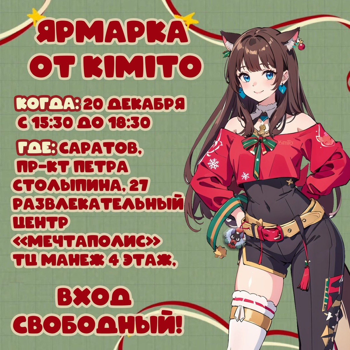 !⛄️ ❓Что вас ждет ❓ ✨Огромная мульти-фандомная ярмарка! Закупайся аниме-стаффом, атрибутикой по играм, фильмам и сериалам! ✨Азиатские сладости: попробуй что-то новенькое и вкусное! ✨K-POP & J-POP товары: для истинных фанатов корейской и японской музыки! ✨Активности и конкурсы, потому что ярмарки от KimiTo - это не только шопинг, но и веселое время с друзьями! 📌Предзаказы уже открыты: https://vk.com/anime_yarmarka64 🖱 20 декабря (суббота) 🖱 15:30 – 18:30 🖱 Развлекательный центр «Мечтаполис» ТЦ Манеж 4 этаж, Саратов, проспект имени Петра Столыпина, 27 Вход свободный! (да-да, бесплатно!) До скорой встречи! ^.^ 💜KimiTo - Твой Аниме магазин!💜