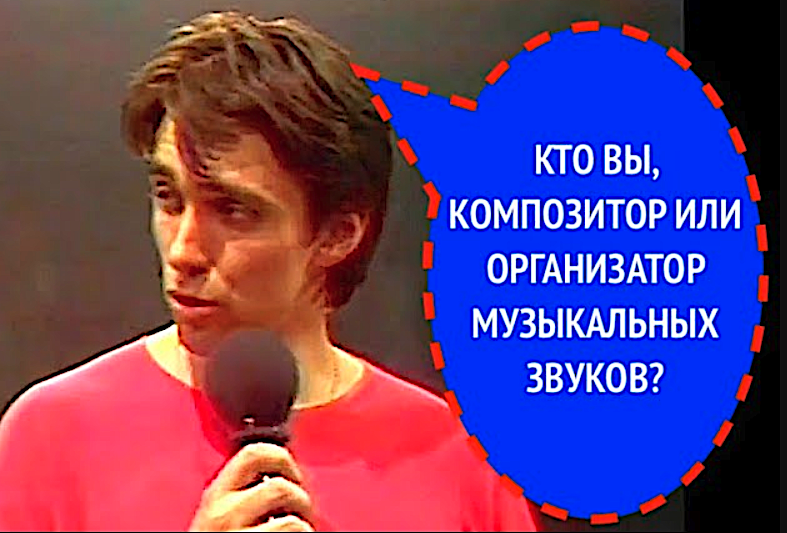 ЗРИТЕЛЬ: «Скажите, пожалуйста, как вы считаете, кто вы на самом деле: композитор либо талантливый организатор музыкальных звуков?» СЕРГЕЙ КУРЕХИН: «Вы считаете, все композиторы должны до сих пор называться композиторами? Человек, который более или менее умело монтирует звуки... Я, помимо звуковой ткани, включаю область визуальную. Там, где музыкальная фраза заканчивается, мне нужно переходить в другое качество — я дополняю это визуальным действием. Это одно является продолжением другого. Линия не прерывается: нет такого, что "здесь мы играли, а здесь мы выпендриваемся" — всё это одно целое. Я строю произведение только по психологии формы. У меня есть, скажем, 10 языков, которыми я пользуюсь в данной программе, я выстраиваю их логичный переход один в другой. Поэтому в традиционном смысле композитором меня назвать очень трудно, равно как и режиссером. Я просто что-то организовываю». Зритель попытался загнать Курехина в рамки классических определений, намекая на то, что его деятельность