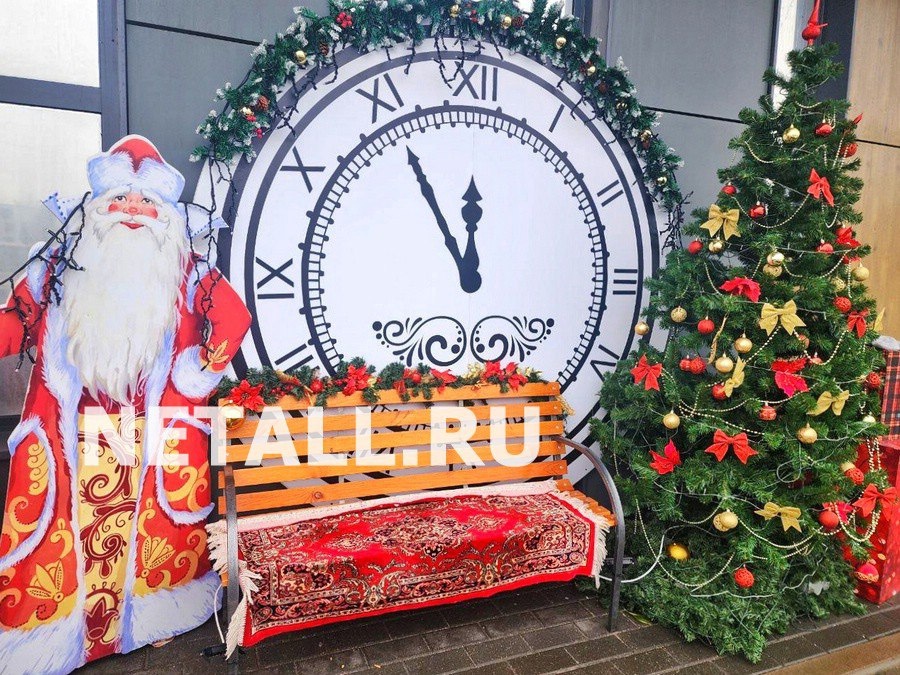 Фотозона с елкой, Дедом Морозом и ковром на скамейке у здания фермерского рынка на Крюковской площади