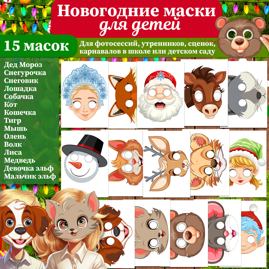 Новогодние маски для детей (комплект 15 масок). Детские новогодние маски подойдут для фотосессии, утренника, карнавала, маскарада, театральных сценок в школе или детском саду. Создайте настоящий праздник с новогодними масками для детей — яркими, весёлыми и простыми в использовании. Этот комплект превратит любого ребёнка в героя зимней сказки: пусть он станет Дедом Морозом, Снегурочкой, Снеговиком или хитрой Лисой из леса. А может, его ждёт приключение в роли ловкого Тигра, стремительной Лошади, мудрого Оленя или волшебного Эльфа? В комплект входит 15 уникальных масок — каждая на отдельном листе формата А4: -------------------------------------------------