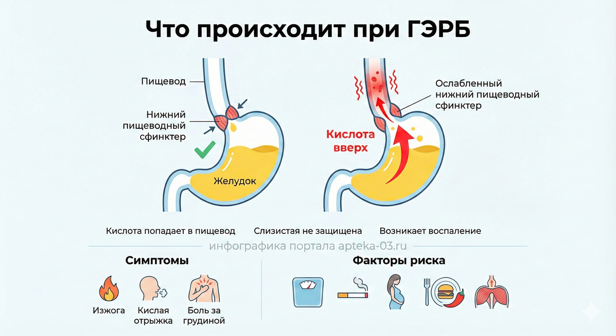 Изжога, кислая отрыжка, боль за грудиной — эти симптомы знакомы миллионам людей. Гастроэзофагеальная рефлюксная болезнь (ГЭРБ) встречается у 11-24% населения России. Разбираемся, какие препараты действительно помогают и как их правильно принимать. При этом заболевании содержимое желудка регулярно забрасывается обратно в пищевод. Причина — ослабление нижнего пищеводного сфинктера, который в норме должен плотно смыкаться после прохождения пищи. Слизистая пищевода не приспособлена к контакту с кислотой, поэтому возникает воспаление. Факторы риска: лишний вес, курение, беременность, грыжа пищеводного отверстия диафрагмы, злоупотребление жирной и острой пищей. Ингибиторы протонной помпы (ИПП) — основа лечения ГЭРБ. Омепразол, пантопразол, рабепразол, эзомепразол блокируют выработку соляной кислоты на клеточном уровне. Это самые эффективные препараты, которые назначают курсом от 4 до 8 недель. Они заживляют эрозии пищевода и надежно контролируют симптомы. ИПП безопасны, но при многолетнем пр