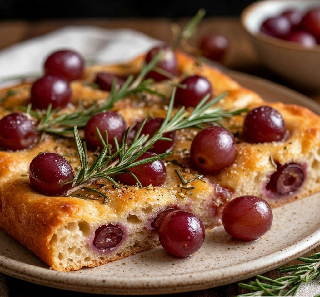 6. Изюминка: Сочетание оливкового масла, хвои розмарина и лопнувшего в духовке сладкого винограда — это магия. Подавай теплой, отламывая руками! 🔥