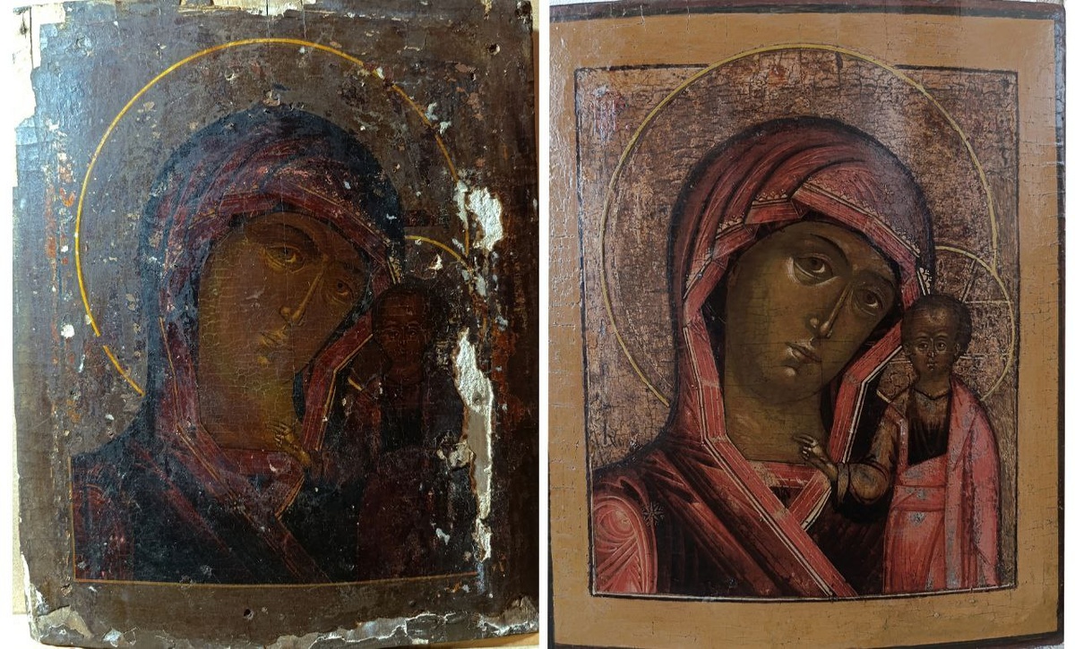 Проведён весь комплекс реставрационных работ- укрепление левкаса и красочного слоя, подведение реставрационного левкаса в места утрат, удаление сильно потемневшей олифы, тонировки с элементами реконструкции. Утраты на золоте притонировпны твореным золотом. Нанесено новое защитное покрытие. ........................ #реставрацияикон #реставрациякартин #художникреставратор #антиквариат #икона #казанскаяикона #антикварнаяикона #реставрация #реставратор #антикварнаякартина@restavrator_art_moscva