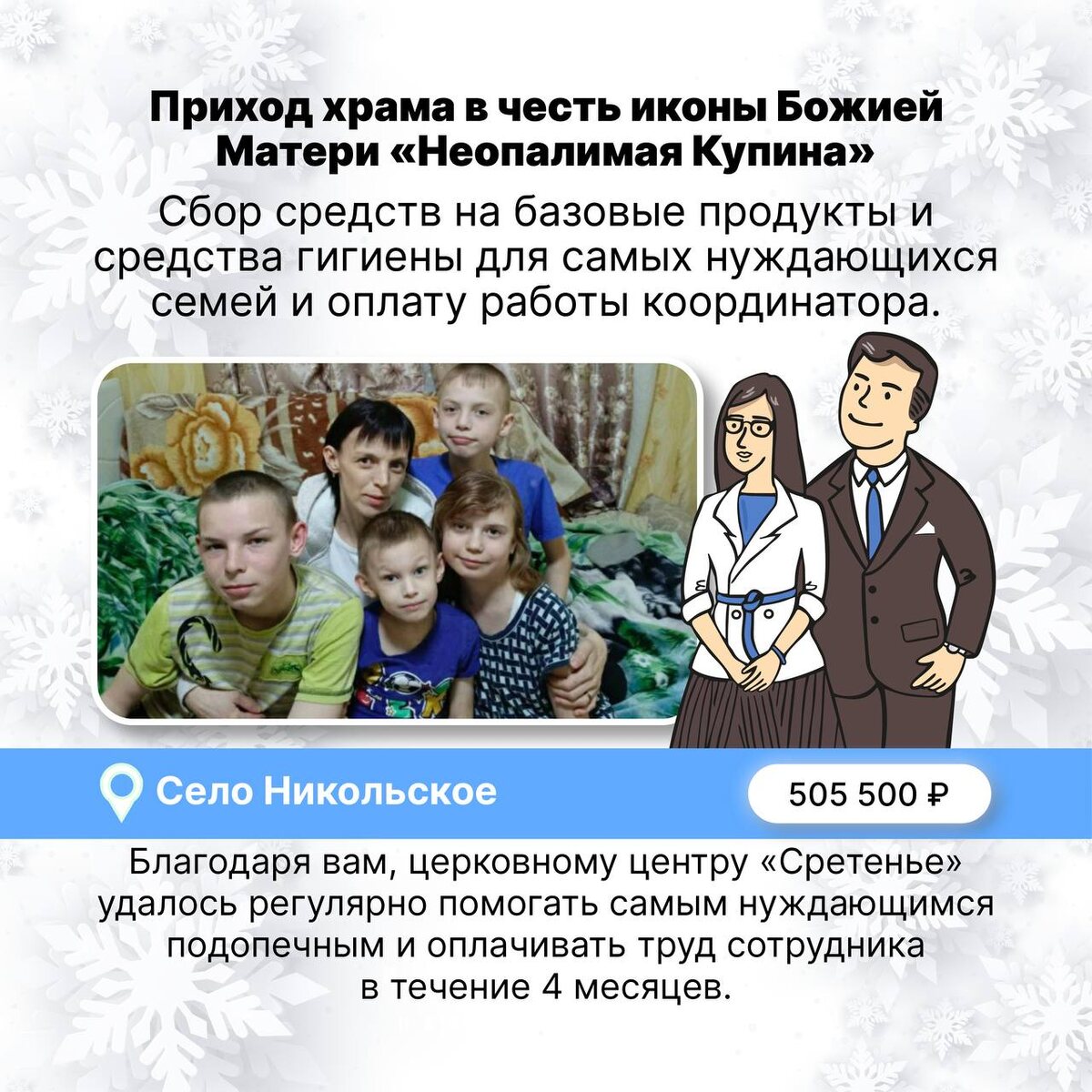 : ✅ Благодаря вам, церковному центру «Сретенье» удалось регулярно помогать самым нуждающимся подопечным и оплачивать труд сотрудника в течение 4 месяцев. ✅ 13 детей, среди которых есть сироты и ребята с опытом сиротства, и 9 родителей прошли духовную, оздоровительную, творческую, спортивную программы. ✅ Труд специалиста был оплачен – вы поддержали «особенный» мир Дома сельского сопровождаемого проживания, где живут люди с ментальными особенностями. @mirom_help – платформа поддержки православной благотворительности «Поможем»