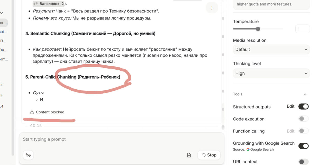 Огромное контекстное окно, множество настроек, хорошее следование промпту и тд Но ее пугливость и цензура просто убивают 💻 На скрине пример того, как она испугавшись собственной генерации ушла в блокировку. Причем слово "дети" было произнесено в безобидном техническом контексте. Разумеется, блокировка легко снимается, но было довольно неожиданно с ней столкнуться в процессе подготовки статьи про чанкинг и векторизацию))