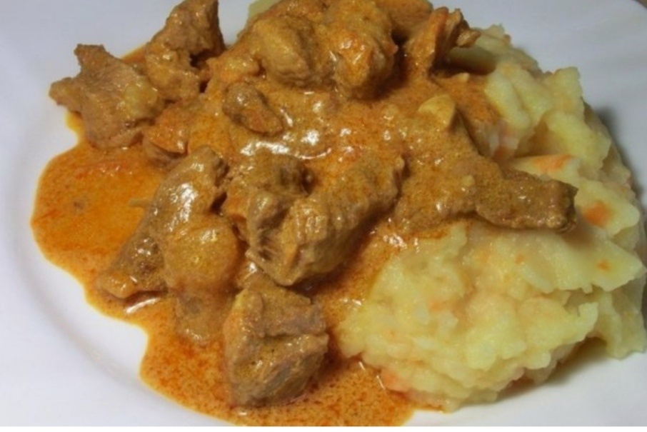 Вливаем всё к говядине и тушим минимум 40 минут под закрытой крышкой на слабом огне.