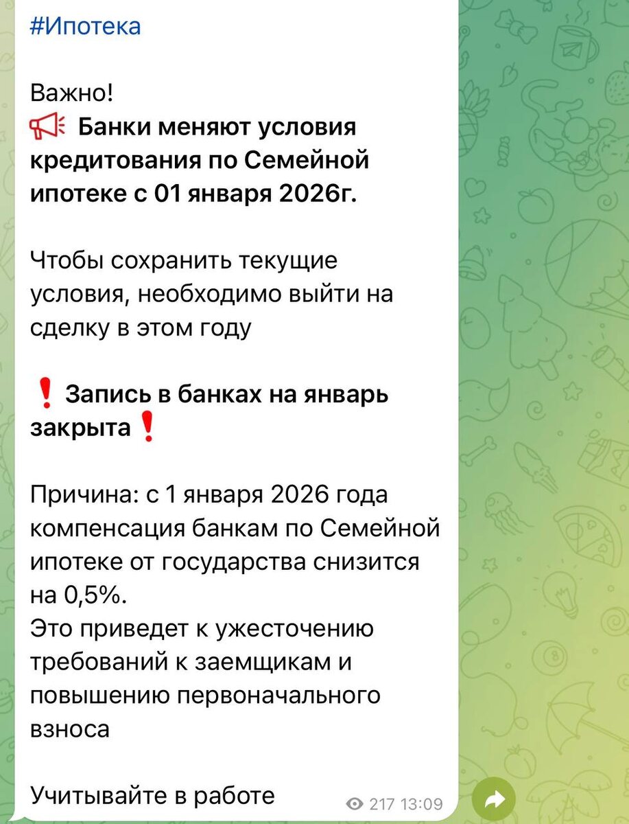 ‼️Агенты подучили рассылку о прекращении записи на январь и изменениях в семейной ипотеке с 1.01.26