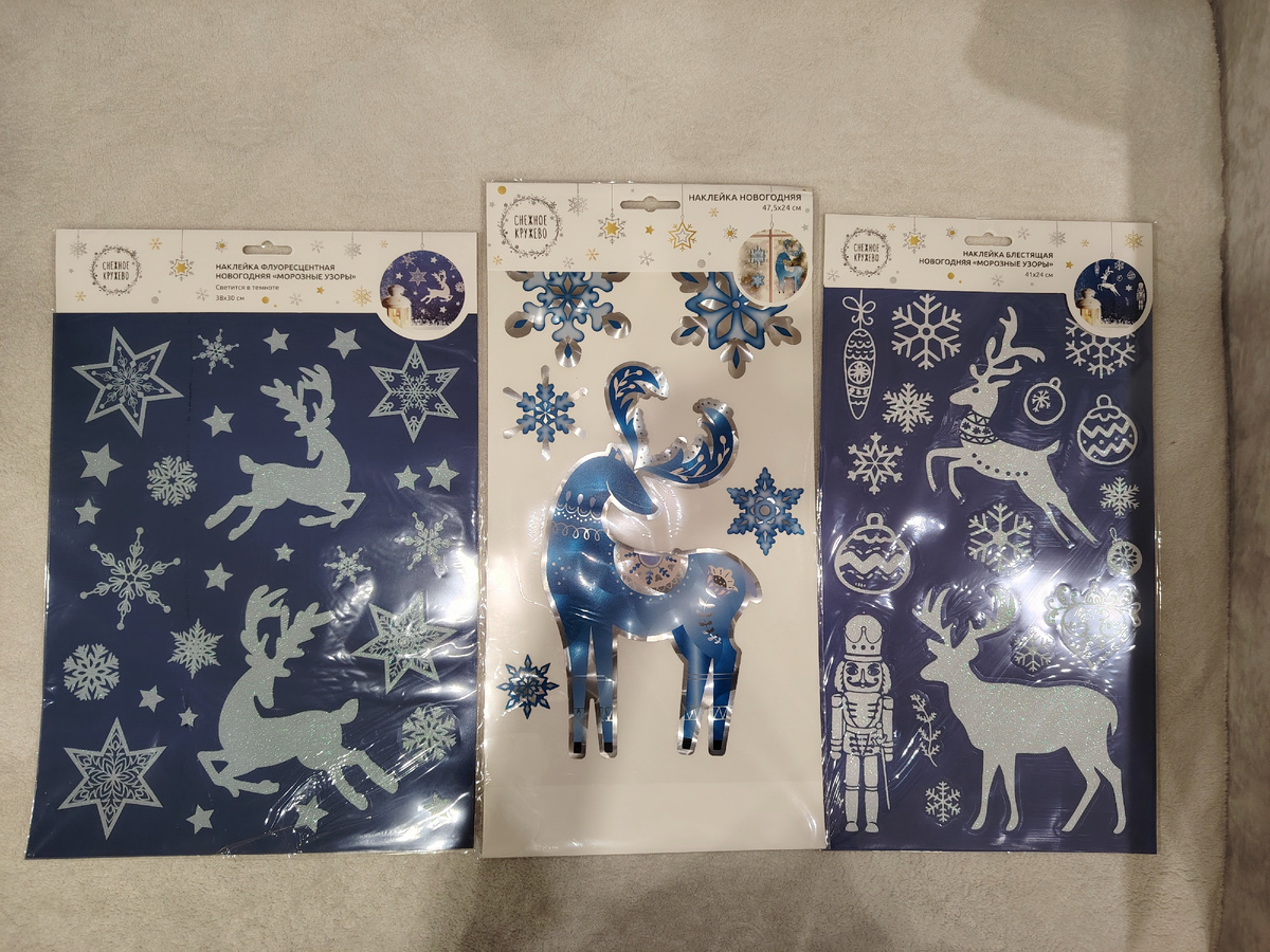 Наклейки на окна дети просли купить, да я и сама их люблю, были еще с шариками, но мне они меньше понравились. Стоили менее 100₽ каждые. Чек мне не дали, только электронный, а приходит он на почту мужа. Так что в конце только общую сумму покупки покажу.