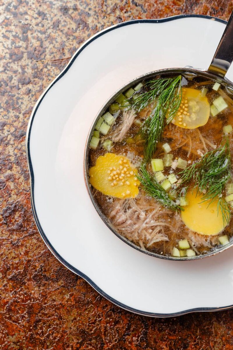 Бренд-шеф Вячеслав Беркут, рестораны Gussi, Москва, Краснодар, Севастополь, Ялта, Роза Хутор, Адлер #рецепт #новогодниеправилашефа Ингредиенты Утка — 1 шт. (около 2.2 кг) Вода — 3 литра Лук репчатый — 1 шт. Морковь — 1 шт. Чеснок — 8 зубчиков Лавровый лист — 2-3 шт. Гвоздика — 1 шт. Черный перец горошком — 15 шт. Соль — по вкусу Укроп — 30 грамм Корень хрена — 8 грамм Соевый соус — 60 грамм Рассол из огурцов — 300 грамм Желатин — 20-30 грамм ( по необходимости) Приготовление Подготовьте утку: Разделайте утку на части: отделите крылья, ножки, грудку и оставшееся мясо. Косточки и хрящи оставьте для бульона. Промойте все части утки холодной водой. Варите бульон: Положите куски утки в большую кастрюлю и залейте холодной водой (около 3 литров). Добавьте очищенную морковь и лук целиком. Поставьте кастрюлю на средний огонь и доведите до кипения. Снимите образовавшуюся пену. Уменьшите огонь до минимума и варите бульон около 4-5 часов, периодически снимая жир и пену. За час до окончания вар