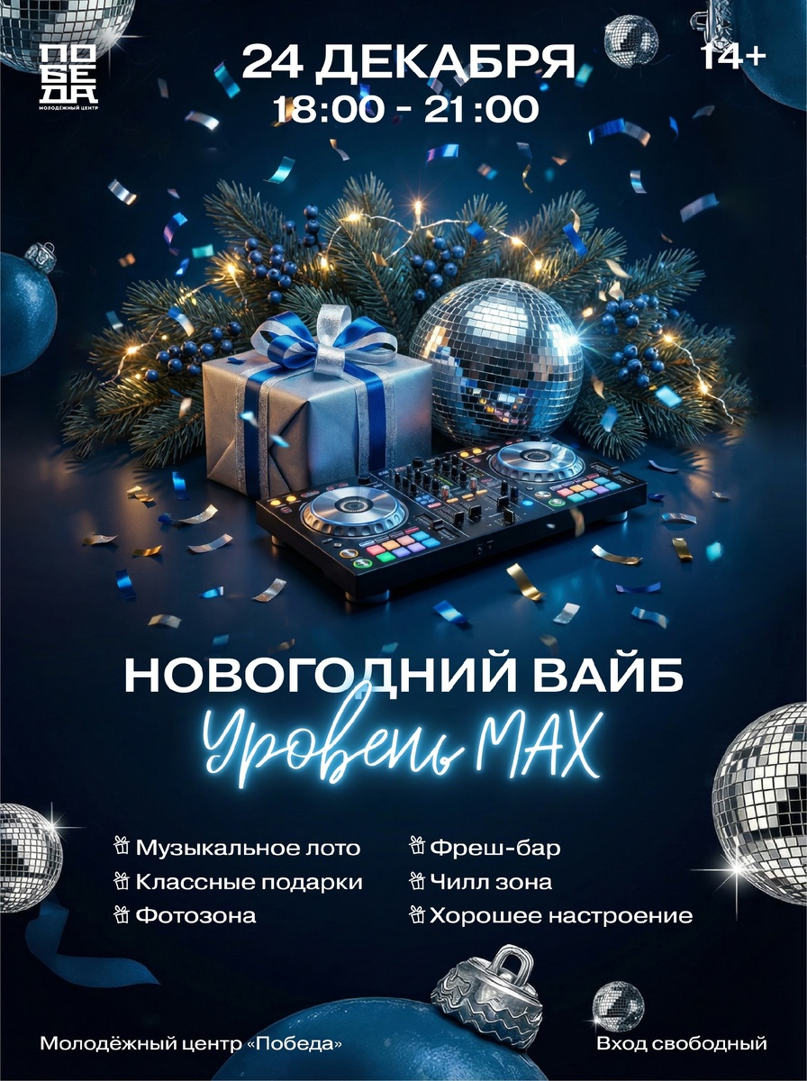 ✨ 🔥 Готов к Новому году на УРОВНЕ MAX? Тогда мы ждем тебя! Молодёжный центр «Победа» приглашает на самую драйвовую новогоднюю тусовку! Забудь про обыденность – лови наш новогодний вайб. Что в программе? 🎶 Зажигательные треки (Музыкальное лото!) 🎁 Крутые подарки 📸 Потрясающая фотозона 🧋 Фреш-бар 😎 Расслабленная чилл-зона ✨ И, конечно, ТО САМОЕ новогоднее настроение! Вход свободный! 14+ Отметим Новый год так, чтобы запомнилось! 😉 📆 24.12.2025🕒18:00 🏢 Молодёжный центр "Победа" 📍 Домодедово, 30-Летия Победы пл., д. 2 💰 Вход свободный❗️ ✅ Мероприятия Домодедово https://dzen.ru/id/66f10385cc4c5a16f7b5fb02 http://vk.com/domodedovo_events http://dzen.ru/domodedovo_events