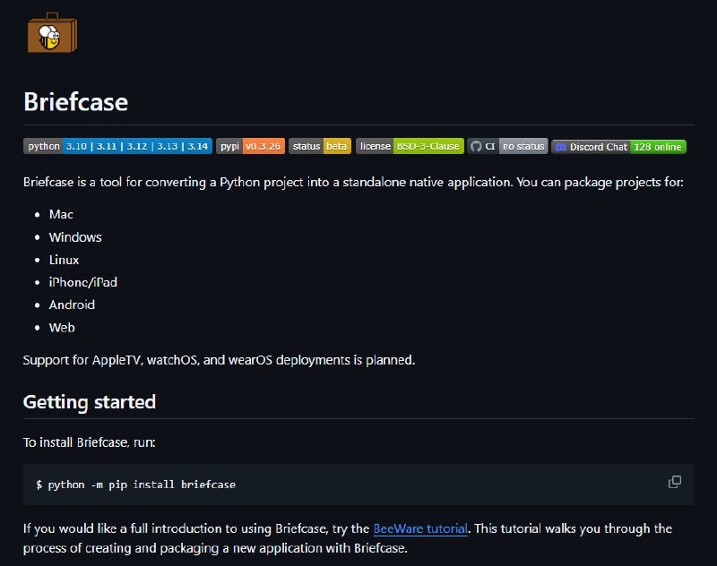 π» Briefcase β ΡΡΠΎ ΠΈΠ½ΡΡΡΡΠΌΠ΅Π½Ρ Π΄Π»Ρ ΡΠΏΠ°ΠΊΠΎΠ²ΠΊΠΈ Python-ΠΏΡΠΈΠ»ΠΎΠΆΠ΅Π½ΠΈΠΉ Π² Π½Π°ΡΠΈΠ²Π½ΡΠ΅ Π΄Π΅ΡΠΊΡΠΎΠΏΠ½ΡΠ΅ ΠΈ ΠΌΠΎΠ±ΠΈΠ»ΡΠ½ΡΠ΅ ΠΏΡΠΈΠ»ΠΎΠΆΠ΅Π½ΠΈΡ ΠΏΠΎΠ΄ Windows, macOS, Linux, iOS ΠΈ