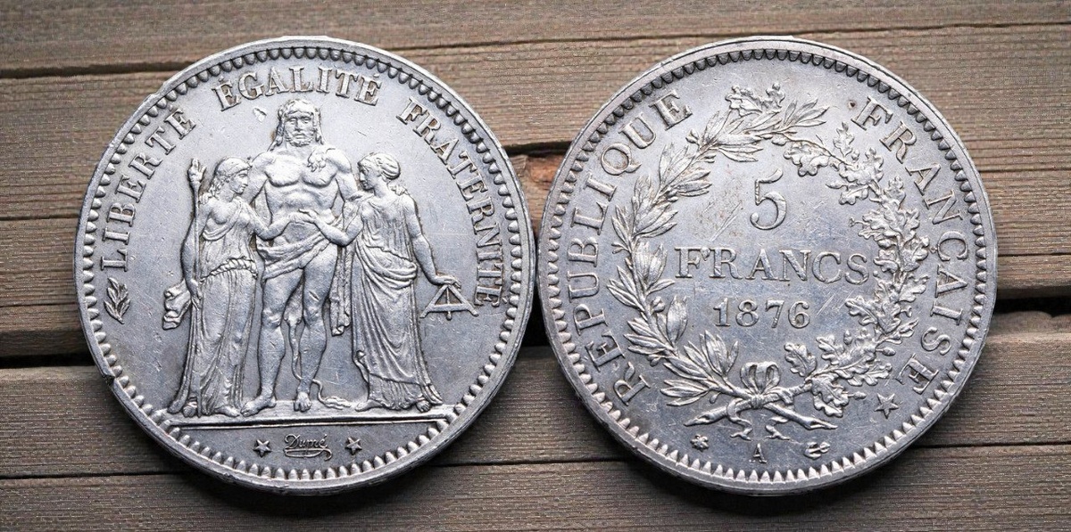 Эти серебряные 5 франков чеканились во Франции в XIX веке, начиная с 1848 года