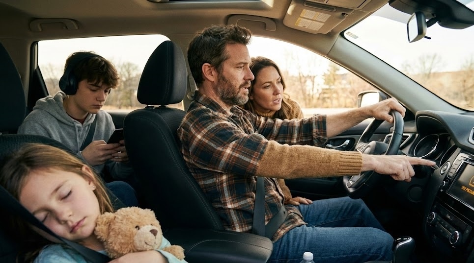 На заднем сиденье двенадцатилетний Максим поднял глаза от телефона: