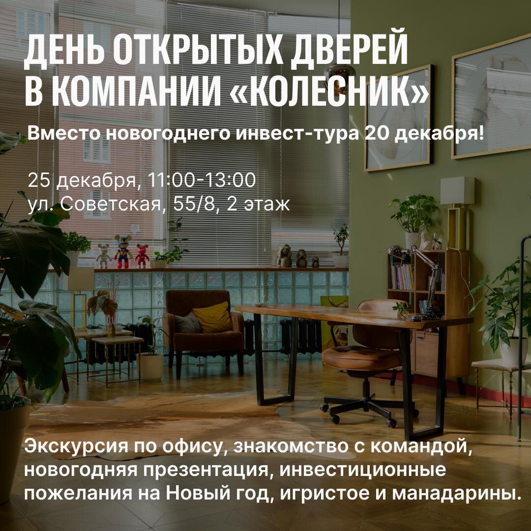 Внимание — из-за мороза отменяем меняем концепцию новогоднего инвест-тура, и переносим нашу встречу на 25 декабря! 25 декабря в 11:00 ждём вас на дне открытых дверей в офисе, вместо экскурсии по объектам — проведем экскурсию по отделам, а затем покажем новогоднюю презентацию, выпьем игристого — или чая, поедим мандаринов и вытянем инвестиционное пожелание на 2026 год, а кому повезет больше, вместо пожелания заберет с собой домой нашего красного коня🎁🐴 Со всеми, кто зарегистрировался на инвест-тур 20 декабря — дополнительно свяжемся лично! 📍Советская, 55/8, 2 этаж, офис компании «Колесник» Регистрируйтесь по ссылке