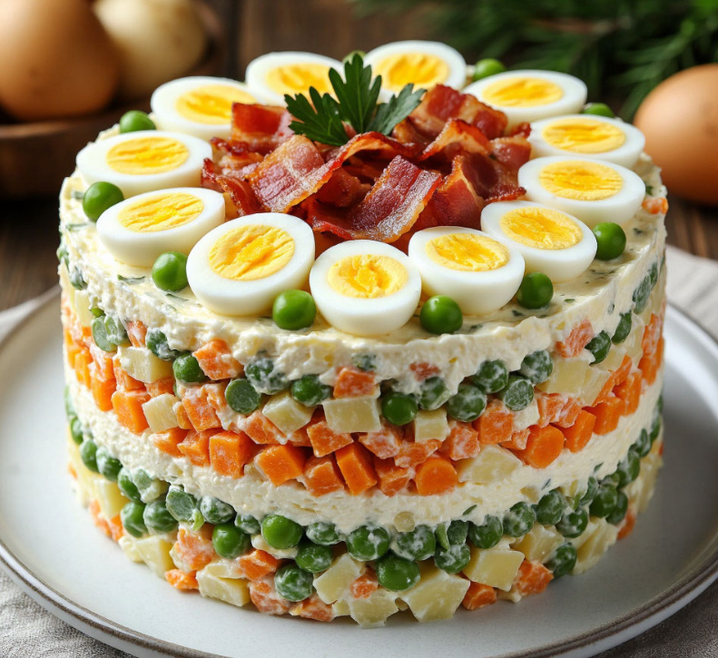 Подавайте оливье в прозрачной посуде, чтобы была видна игра цветов: золотистый картофель, оранжевая морковь, зелёный горошек, белоснежные яйца и янтарные огурцы. Украсьте веточками петрушки или фигурными ломтиками моркови — это добавит праздничности без лишних усилий.