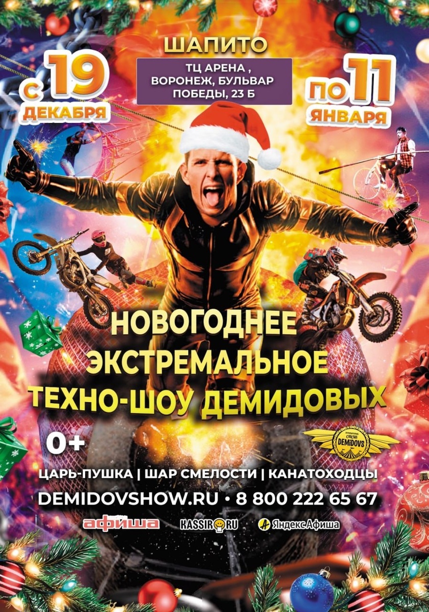 🔥🔥🔥🔥 🎅 Друзья! Воронеж! Не пропустите НОВОГОДНЕЕ ЭКСТРЕМАЛЬНОЕ ТЕХНО-ШОУ ДЕМИДОВЫХ со скидкой 20%!🎅 ⏰ Даты проведения: с 19 декабря по 11 января 🚩 ТЦ "Арена" (г. Воронеж, бульвар Победы, 23 Б) ‼️ Скидка на цирковое представление только для членов профсоюза. Заявки принимаются только в WA или по тел: +7 (987) 984-77-77 Бронируйте, предъявив фото вашей карты, билеты забирать в кассе цирка Скидка 20% от заявленной цены в кассе, на сайте. Смотреть свободные места https://demidovshow.ru/ *Билеты приобретенные со скидкой возврату не подлежат. 🎇 Информация о программе: Это НЕ ОБЫЧНЫЙ цирк. Здесь вы не увидите животных, но испытаете невероятную гамму эмоций: драйв, зашкаливающий адреналин, леденящий страх и безудержный восторг! Магия – в экстриме, мастерстве и смелости артистов со всего мира! "Шар смелости" - рекордное число бесстрашных мотокаскадеров в одной клетке! Их отвага заставит ваше сердце биться чаще! "Человек-Ядро" - невероятный выстрел живым снарядом из Царь-пушки –