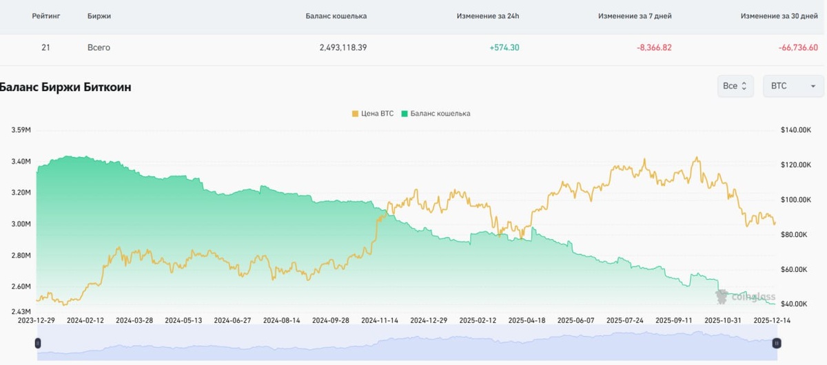 🚨Баланс биткойнов на биржах продолжает сокращаться, что полностью отличает этот цикл от прошлого