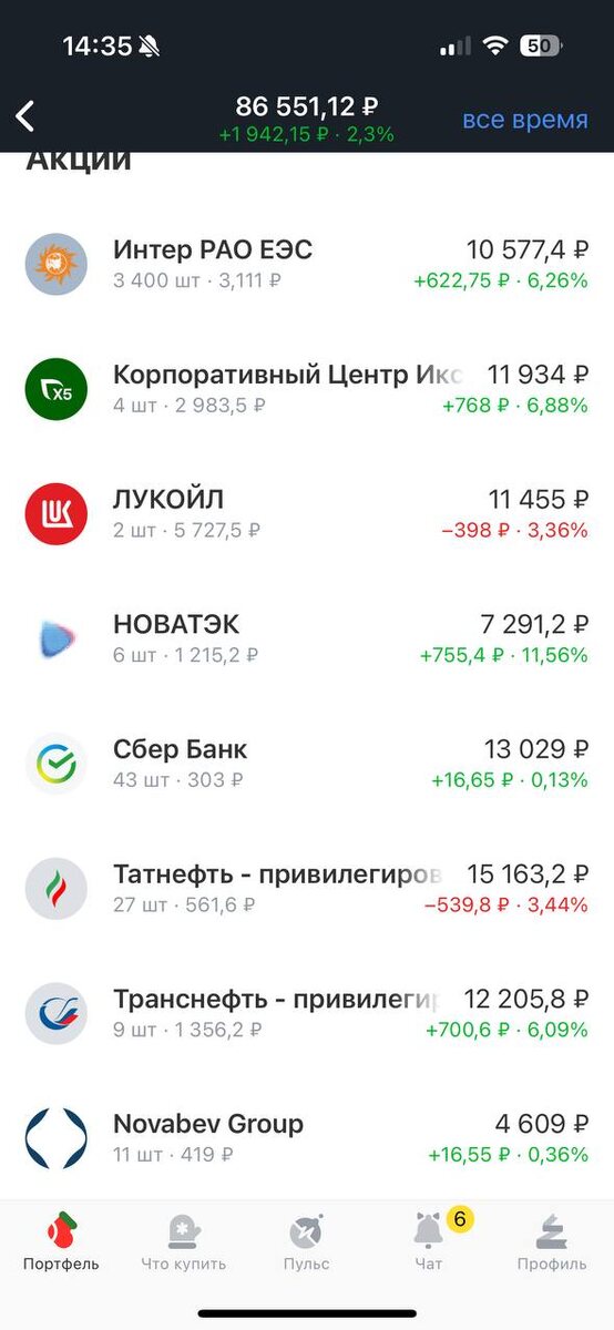 👀 День #240 💰 Неделя не успела начаться, а половина от рабочей - уже прошла. Предновогодняя суета делает свое дело Я сегодня сделал свое обычное пополнение - 450 руб., и купил еще 1 акцию Сбербанка 🏦, продолжаю постепенно увеличивать доли в выбранных мною компаниях, как говорится - курочка по зернышку клюет Можно сказать, что скучно и неинтересно, но я и не играю в казино или автоматы, ловлю себя на мысли, что мне и не должно быть весело, просто нужно делать, что должен и все получится. Сегодня данные по инфляции перед заседанием в пятницу, а помимо новостей каких-то значимых нет, внешние дела - как качели, уже большинство не обращает внимание на различные высказывания, а по внутренним ничего особо интересного нет, только судьба КС. Всех с наступающим! Не болейте ❤️ • Стоимость портфеля: 86 551.12 руб. • Сумма вложений: 83 150 руб. • Дивиденды/купоны за ОП: 0 руб. • Общий рост/убыток: + 3 401.12 руб. • Рост/убыток за ОП: + 2 225.63 руб. • Факт/план: 86 551 / 100 000 (86.55%)+0.