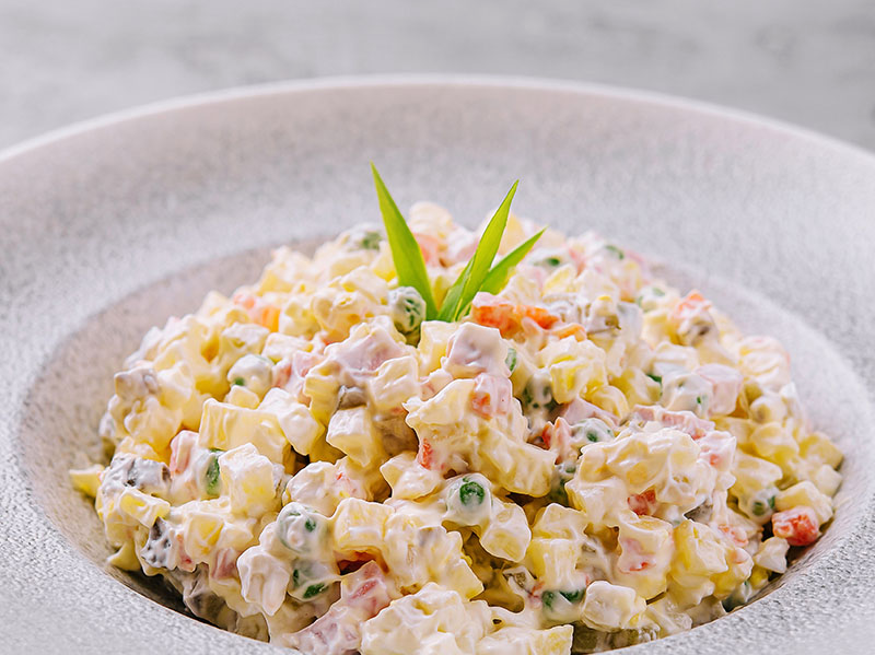 Без этого салата невозможно представить себе ни один Новый год. Его нежная текстура, сочетание соленого, сладкого и кислого, а также сытность делают его абсолютным лидером. Существует множество вариаций Оливье, но мы предлагаем вам приготовить его по проверенному рецепту: