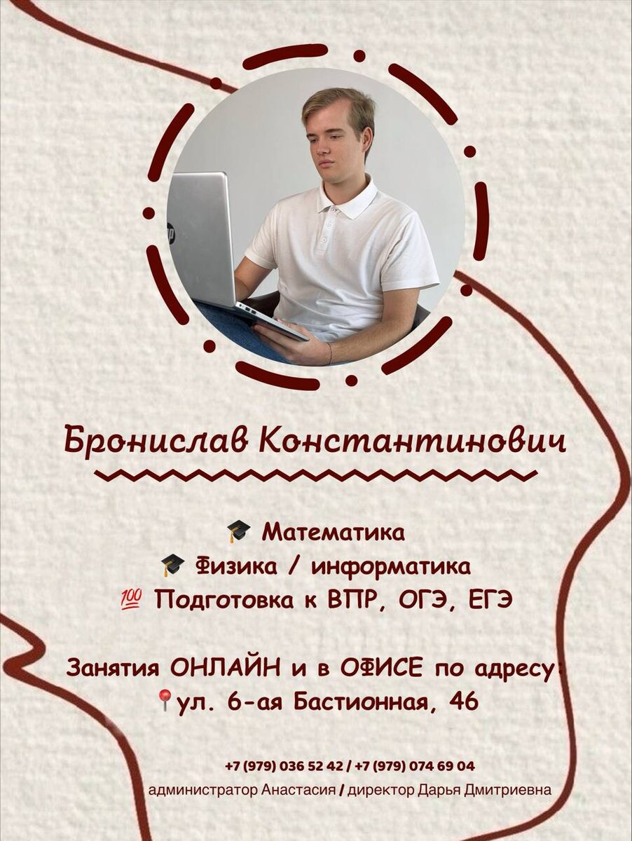 📚 👨🏫 Ваш сильный репетитор по точным наукам и программированию! Эксперт в подготовке к экзаменам. Поможет освоить и полюбить: ✅ МАТЕМАТИКУ ✅ ФИЗИКУ ✅ ИНФОРМАТИКУ (С++, Паскаль) ✅ Подготовит к ВПР, ОГЭ и ЕГЭ Бронислав Константинович — выпускник факультета информационных технологий СевГУ. Его глубокие знания и опыт работы с подростками позволяют объяснять сложные темы просто и понятно. 🏢 Выбирайте удобный формат: • Занятия в офисе на ул. 6-ая Бастионная, 46 (гост. «Крым», ост. «Площадь Восставших»). • Онлайн-уроки с четкими презентациями, конспектами и всеми материалами. С ним вы не просто «прорешаете» задачи, а поймете логику предметов, что гарантирует уверенность и высокие баллы на экзаменах! 💯 Покоряйте точные науки с лучшим наставником! Записывайтесь на занятия прямо сейчас! Запись в Telegram: 📞 @delaykaknado_admin (администратор) 📞 @DariyaDmitrievnaa (директор) Группа ВК: 📎 https://vk.com/delaykaknadorepetit #репетитор #делайкакнадо #физика #математика #информатика