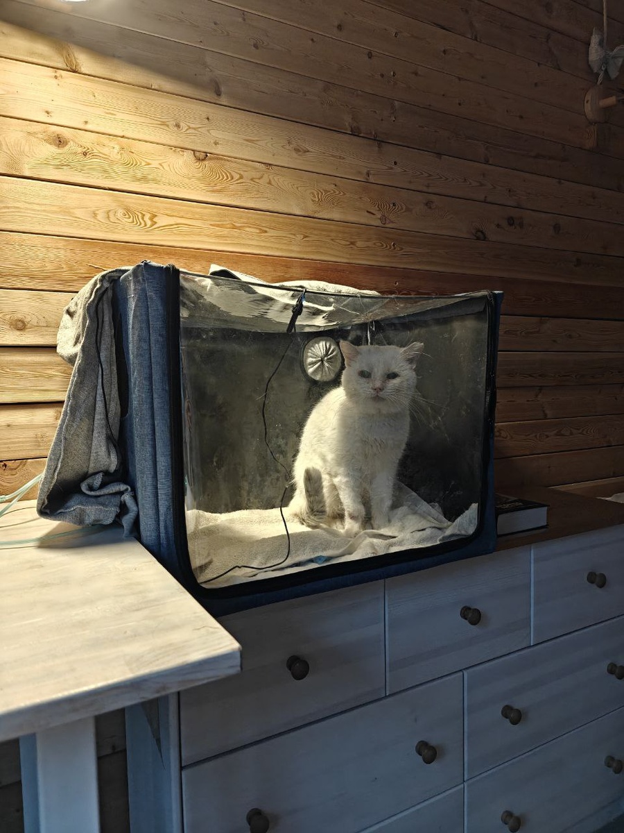 Сидит в боксе, смотрит на улицу, понял, что тепло пришло и мы пойдем гулять