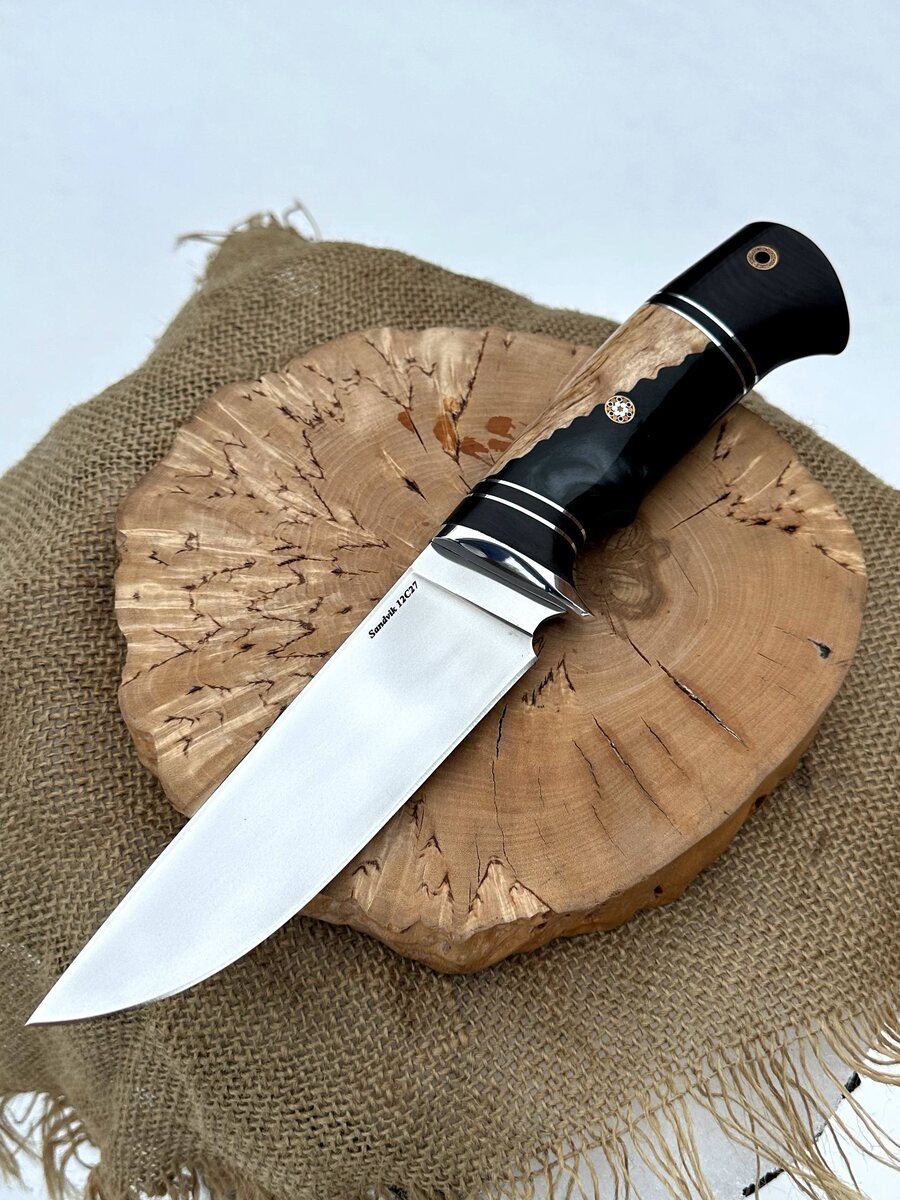 ! 🔪 Клинок из шведской нержавеющей стали Sandvik 12C27 — прочный, острый, не требует частой заточки. ⚙️ Полные спуски от обуха обеспечивают идеальный рез — режет без усилий, даже твёрдые продукты и древесину. 🖐 Рукоять из чёрного граба, карельской берёзы и акрила с мозаичными пинами — удобно лежит в руке, не скользит, смотрится эффектно. 🔒 Анатомическая форма — комфорт для любой ладони даже при длительной работе. 🪓 Твёрдость клинка: 60 HRC — долго держит заточку. 🎁 В комплекте — ножны из натуральной кожи. Можно заказать формованные ножны (+8000₽). 💰 Цена: ~12 680₽~ 👉 по акции: 8500₽ 📲 Для заказа: • Пишите в Telegram: [@Nazarklinokbot](https://t.me/Nazarklinokbot) • WhatsApp/Viber: [ +7 910 134-38-31](https://wa.me/79101343831) #нож #ручнаяработа #кузницаназарова #нождляохоты #подарокмужчине #туризм #коллекция