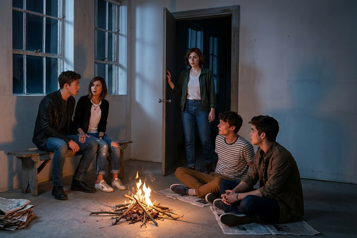В середине комнаты, как и предполагала Инна, горел небольшой костерок, сооружённый прямо на бетонном полу, из каких-то веточек, рядом валялась пачка газет, видимо, в качестве горючего. Возле стены стояла маленькая деревянная скамеечка. На ней, и возле костерка на таких же газетах, сидели четверо. Три парня, примерно одного возраста с Инной, и молоденькая девушка. Одного взгляда хватило, чтобы понять, что эти четверо не имеют никакого отношения ни к бомжам, ни к алкоголикам и беспризорной шпане. Опрятно одетые, типичного городского вида молодёжь.