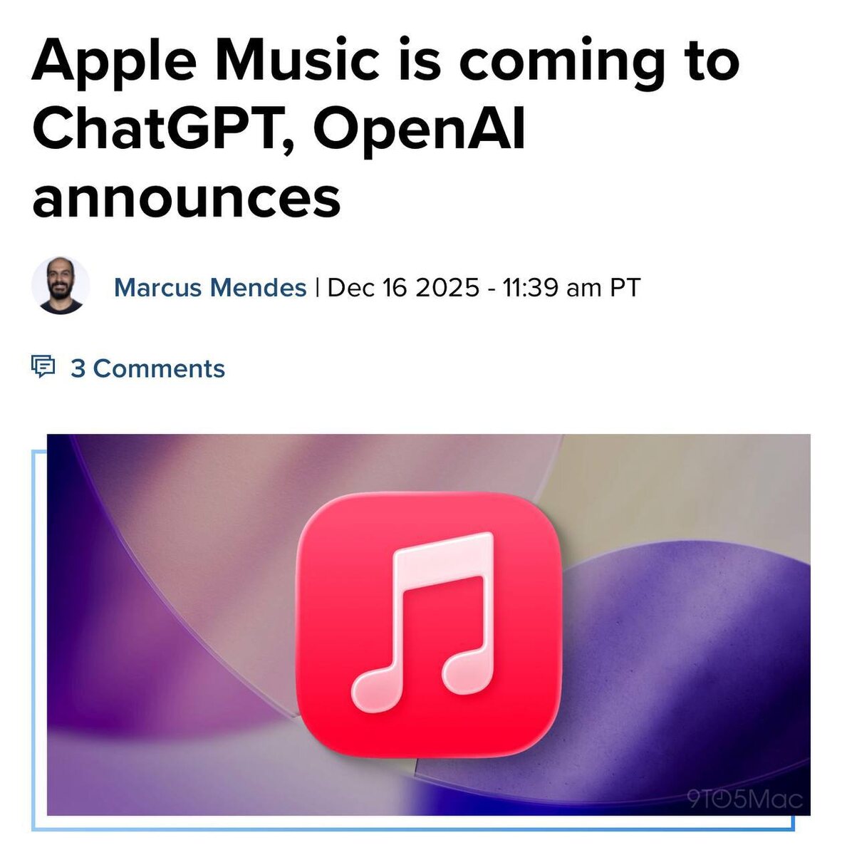 OpenAI готовит интеграцию Apple Music прямо в чат. — Плейлисты по настроению, описанию или ситуации — Поиск музыки обычными словами, без жанров и фильтров — Управление подборками прямо в диалоге — Никаких сложных настроек — просто пишешь, что хочешь услышать Функцию уже внедряют, скоро станет доступна.