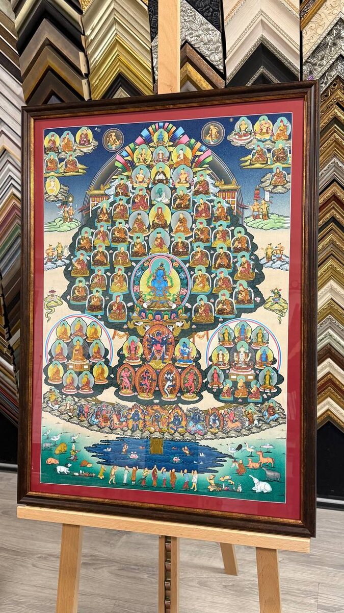 Чаще всего их называют буддийскими иконами, но точнее думать о них как о духовных картах. 🌳 Сегодня в работе — особенная тхангка: «Древо Прибежища» школы Карма Кагью, или Алмазного пути. Это не просто изображение святых, а подробная схема передачи мудрости — от самого Будды до современных учителей, таких как Лама Оле Нидал. Что изображено на этой «карте»? 📍 В центре — символ изначального просветления. 📍 На стволе и ветвях — цепь мастеров: индийские йогины, тибетские отшельники и держатели линии, такие как Кармапы. 📍 Каждая фигура — не портрет, а указатель на определённое качество ума или этап пути. Это древо — ключевой объект для медитации. Практикующий, глядя на него, мысленно соединяется с непрерывным потоком знания и вдохновения, как если бы подключался к живому источнику. Обрамление такой работы — особая задача. Багет должен быть сдержанным, не конкурировать со сложной символикой, но и достойно подчёркивать значимость предмета. Часто выбираем тёмное дерево или глубокие тона