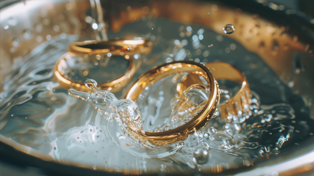 Тёплый мыльный раствор подходит для большинства украшений из золота с бриллиантами и даёт мягкое очищение без риска для металла и камня. Он удаляет пот, кожный жир, остатки крема и мыла, не травмируя оправу и крепления.