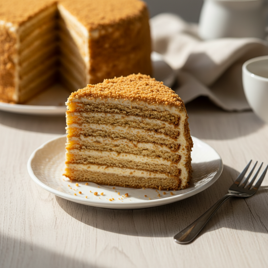 Этот медовик хорош тем, что коржи пористые, быстро впитывают крем. Но если хотите еще нежнее, перед кремом слегка смочите каждый корж молоком с ложкой меда — тает прямо во рту.