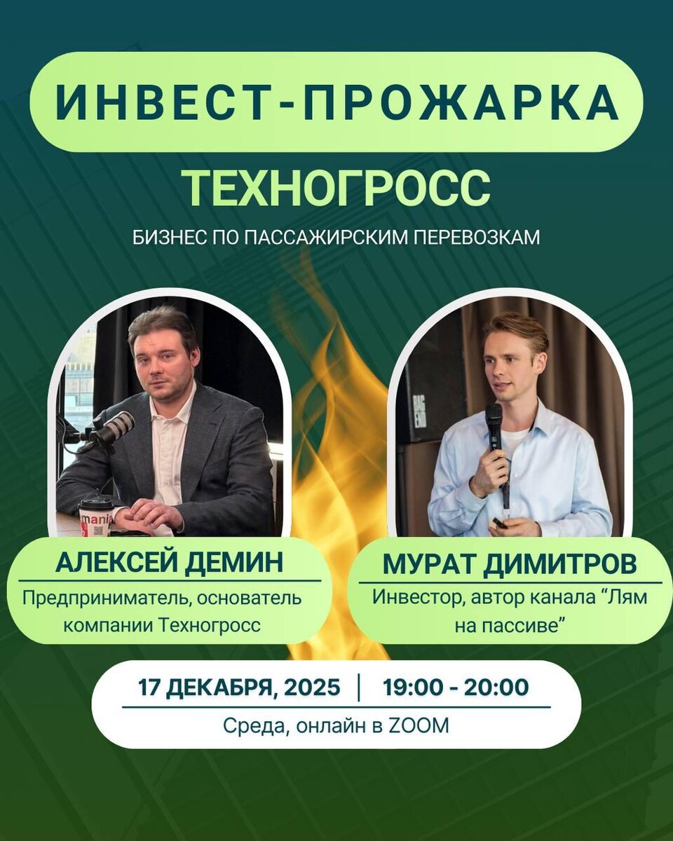 17 декабря (ср) прожарка автопарка бизнес такси Сегодня в 19:00 состоится закрытая онлайн-прожарка, на которой предприниматель презентует проект автопарка бизнес-такси, а инвесторы зададут ему неудобные вопросы 👉 Подробнее 18 декабря (чт) бизнес-завтрак «Топ-3 стратегии инвестирования в 2026 году» Завтра в 12:00 в центре Москвы расскажу о трёх ключевых стратегиях для инвестиций в 2026 году 👉 Подробнее 18 декабря (чт) онлайн-встреча «Что ожидать от рынка инвестиций в 2026 году» Завтра в 19:00 в ZOOM встречаюсь с инвесторами, чтобы обсудить прогнозы и ключевые тренды на 2026 год в недвижимости и бизнесе 👉 Подробнее