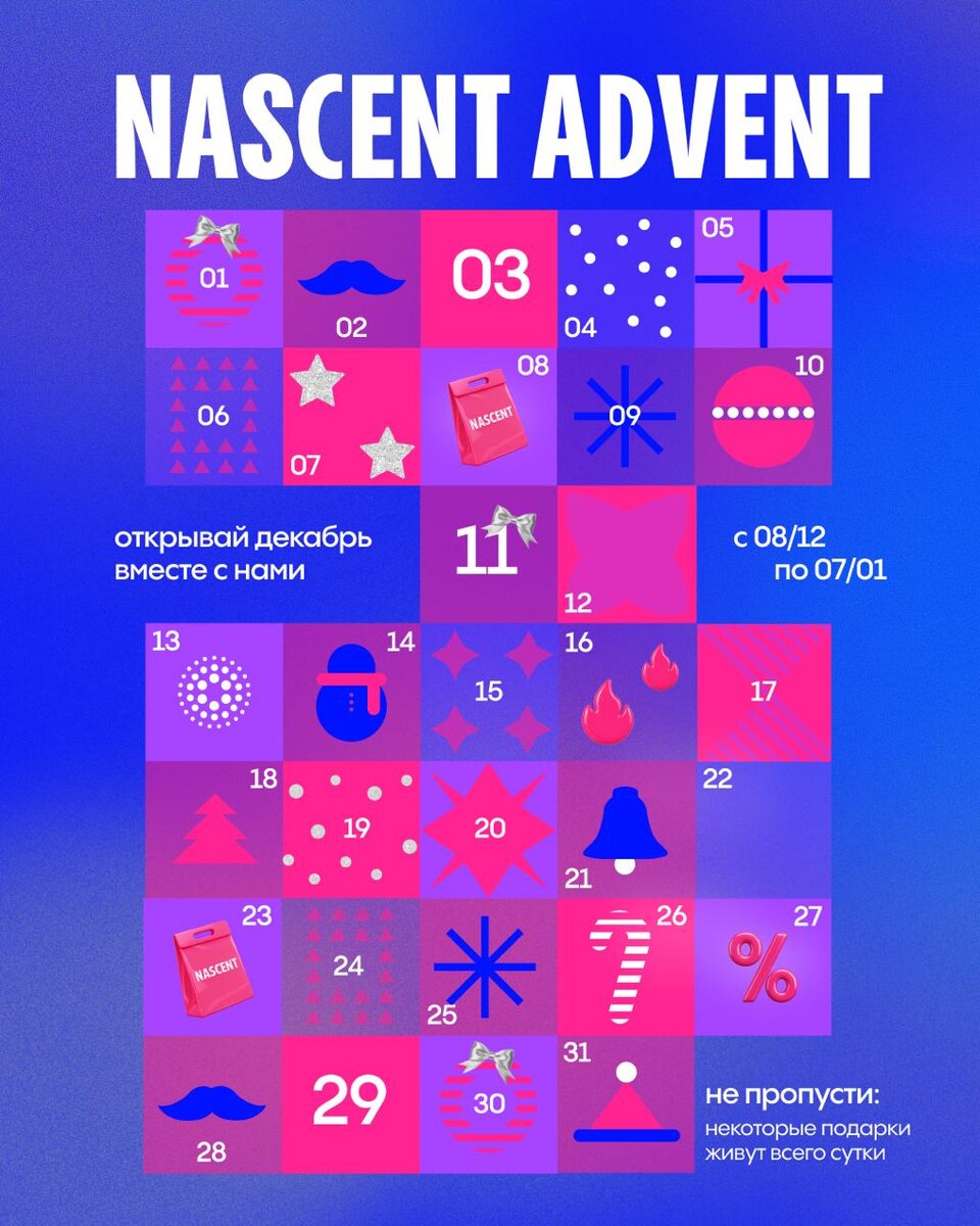 ! Каждый день: новая клетка, новый шанс урвать бонус, задание, ништяк от команды или даже добраться до больших суперпризов — золотой карты и — барабанная дробь — билетов в Корею! Первое окно открылось уже сегодня, скорее беги в сторис 📂 чтобы войти в игру: 1. подпишись на все соцсети NASCENT 2. следи за историями и анонсами 3. и не пропускай ни одного дня Листай карусель, чтобы прочитать все правила* → *Полные правила проведения активности читай на нашем сайте ⭐️