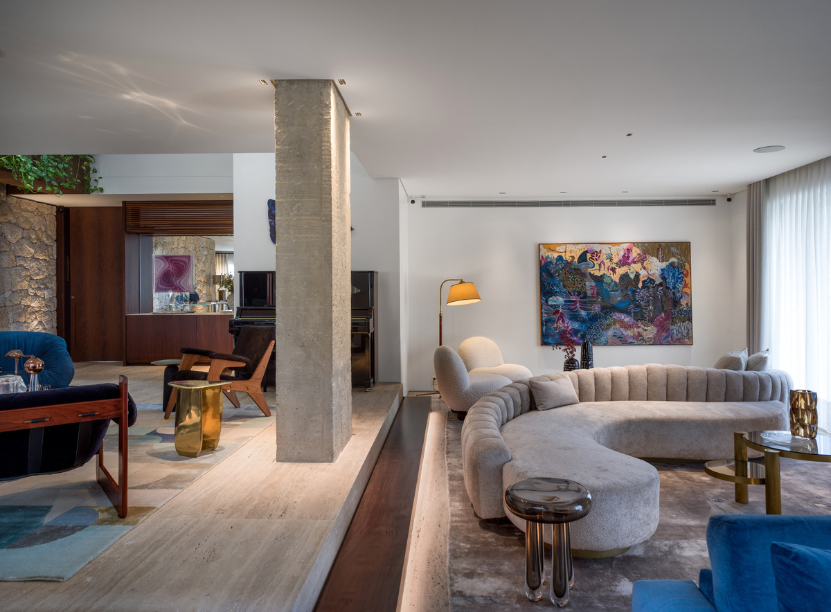 В престижном районе Жардинс в Сан-Паулу расположился 580-метровый пентхаус — новый дом для молодой пары с двумя детьми, оформленный известным в Бразилии дизайнером Диего Револло (Diego Rivollo). Здание 1980-х годов, созданное компанией Adolfo Lindenberg, стало идеальной основой для проекта, в котором классическая архитектура и актуальная декоративная эстетика встречаются в изысканном материальном диалоге. Недавняя реновация придала пространству современность, но оставила главное достоинство квартиры — ее монолитные, благородные материалы, особенно полы из необработанного травертина Romano, покрывающие почти всю нижнюю зону. Теплая пористая структура камня, его мягкая матовость и легкие природные прожилки стали ключевым ориентиром дизайнерской концепции. Работая со столь высокой планкой качества существующих поверхностей, архитекторы стремились не перекрывать, а раскрывать достоинства базовых материалов, добавляя лишь легкие, точные штрихи. Существующая каменная отделка, массивные сте
