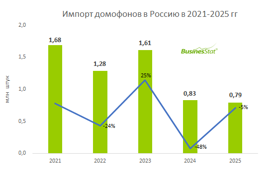 В 2024-2025 гг импорт домофонов в Россию снизился на 51% до 0,79 млн шт.