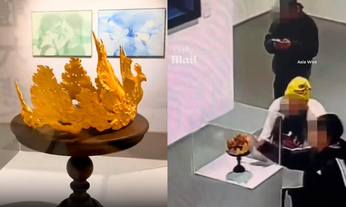 А надо было просто не прыгать на экспонаты… Послушайте! Ведь, если рядом с экспонатами висит табличка «Руками не трогать» — значит — это кому-нибудь нужно? Значит — кто-то хочет, чтобы так было? Но некоторым посетителям музея правила не писаны. А если писаны, то не читаны. Однако незнание музейных правил, как мы помним, не освобождает от ответственности. Вот и один юный гость выставки в Пекине проверил это на собственном опыте. Как пишет Daily Mail, выставку, которую посетил любопытный подросток, организовала китайская блогерша Чжан Кайи вместе со своим мужем. Старинных артефактов с исторической ценностью там не было — в основном новодел. Одним из экспонатов была золотая корона весом почти в два кило, к которой приложил руку супруг женщины. Чжан Кайи описала ее как «уникальное свадебное украшение, лично разработанное и изготовленное вручную ее мужем». Называть стоимость экспоната в юанях, долларах или евро никому раньше не приходило в голову — у драгоценной короны была больше глубоко л