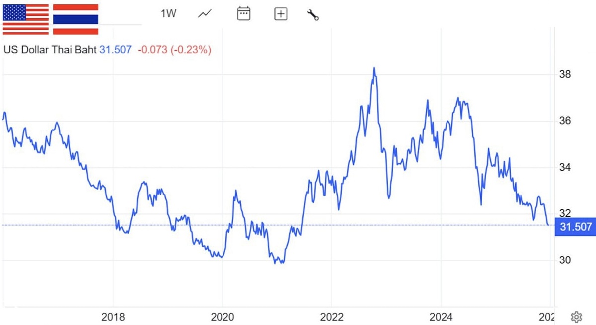 Если вы читаете тайские деловые новости, то могли заметить, что тайский бат на прошлой неделе укрепился до четырехлетнего максимума. Если точнее, бат «потрогал» отметку 31,523 за доллар. Для тайской прессы это большая и тревожная новость, поскольку ориентированная на экспорт экономика заинтересована в слабой нацвалюте. И даже туризм – это тоже своего рода «экспорт услуг», поскольку покупатели в конечном счете оплачивают отдых своими иностранными рублями, долларами и юанями. Но я хочу заострить внимание на этой новости по другой причине. Взлет бата до четырехлетнего максимума выглядит по-разному изнутри Таиланда и из-за пределов. 🖋 Для тайских экспортеров и в краткосрочной перспективе вся история укрепления бата в 2025 году – невыгодна. С начала года THB подрос к USD на 8%, показав один из лучших результатов в Азии. 🖋 Но если смотреть чуть шире, чем только глазами экспортеров и только в контексте 2025 года, то сейчас мы видим как раз пример той стабильности тайской валюты, которая и