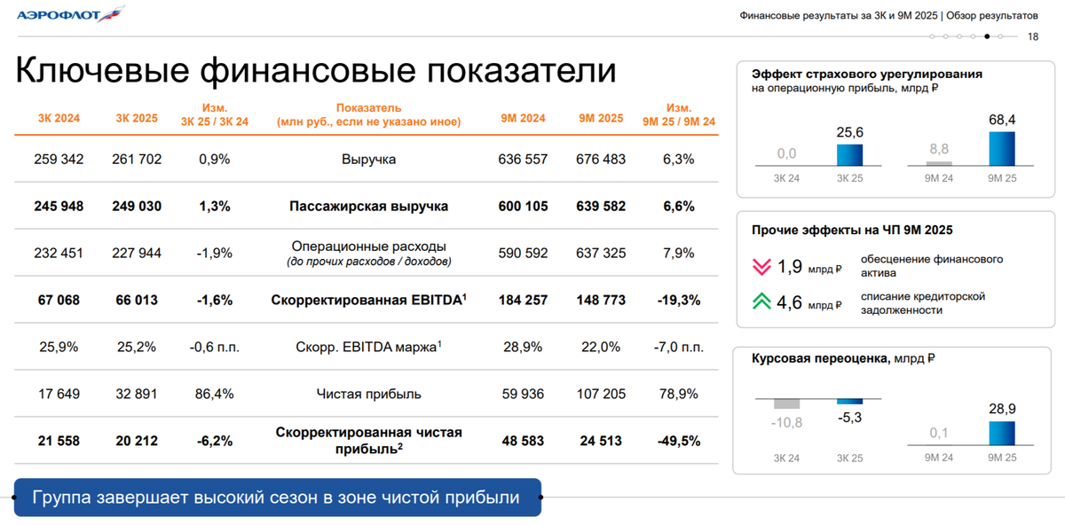 Аэрофлот представил нам фин. результаты по МСФО за III квартал и 9 месяцев 2025 г. Значительное сокращение опер. расходов помогло в III кв. существенно нарастить прибыль, но мы знаем, что эмитент платит дивиденды от скорректированной, а она гораздо меньше. Помимо этого, выплаты по демпферу ниже 2₽ млрд, а помощь государства очень важна (основная статья расходов компании, это авиационное топливо — 38%): ✈️ Выручка: III кв. 261,7₽ млрд (+0,9% г/г), 9 м. 676,5₽ млрд (+6,3% г/г)