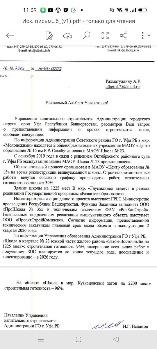 Сроки окончания строительства школ в Уфе сильно отодвигаются Постоянно держу на контроле строительство школ в нашем городе, так как эта проблема ощутимо волнует горожан. И вот пришел очередной ответ от УКС Администрации г.Уфы Микрорайон "Молодежный", школа №23 - срок сдачи в эксплуатацию ... ноябрь 2025 года. На данный момент строительная готовность - 39%! Новые сроки сдачи объекта неизвестны... Микрорайон "Глумилино", школа на 1225 учащихся должна была быть сдана в конце этого года. Однако, судя по ответу городских властей новый срок - лишь 2 квартал 2026 года... Школу в микрорайоне "Кузнецовский затон" обещали сдать в эксплуатацию также в конце года, однако со слов мэра Уфы Мавлиева сроки сдвинуты на 2 квартал следующего года... В микрорайоне "Затон-Восточный" уже несколько лет не могут открыть школу. Пока обещают в следующем году... Вот такая ситуация с новыми образовательными учреждениями в Уфе. Много раз писал, что пока не начнут наказывать не только застройщиков, но и ответстве
