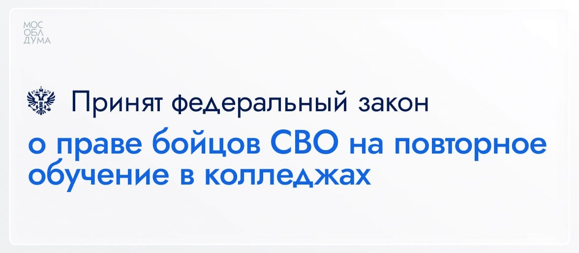 ❗️На федеральном уровне принят и подписан Президентом РФ закон о предоставлении права участникам СВО на бесплатное второе среднее профессиональное образование. 🔹Законом предлагается предоставить право участникам СВО повторно после получения среднего профессионального образования бесплатно получить профессию в колледже или техникуме по другому направлению подготовки. «Данная инициатива логично встраивается в существующую систему государственных гарантий для наших защитников и их семей. В соответствии с уже действующим законодательством, право на первоочередное зачисление в учреждения СПО уже имеет широкий круг лиц. В этот список входят и герои России, и военнослужащие, участвующие в СВО, участники боевых действий в ДНР и ЛНР с 2014 года, а также дети участников спецоперации. В учреждениях СПО Подмосковья учатся порядка тысячи участников СВО и детей защитников», – отметил Игорь Брынцалов. Перечень государственных профессиональных образовательных организаций, расположенных на территор