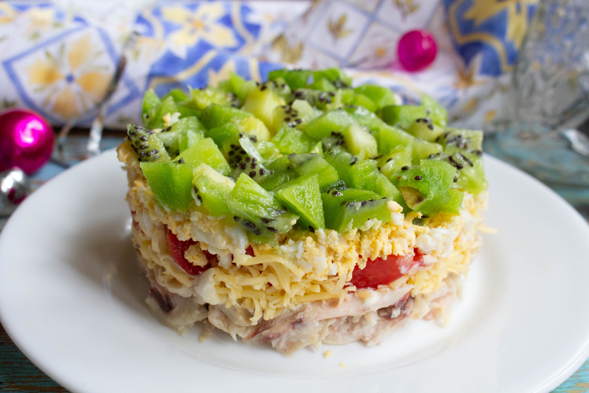 Этот легкий салат понравится всем, кто любит необычные сочетания вкусов. Готовить такой салат просто, а если сварить куриное мясо заранее, то и быстро. Куриное филе можно взять с любой части тушки. Сыр для приготовления подойдет любой твердый/жирный, который вы обычно предпочитаете. Если вы не употребляете майонез, то слои можно промазать сметаной. Какие слои промазывать тоже решать вам. Все слои можно солить, если это нужно, многим хватает соли от майонеза и сыра. Помидоры выбираем сладкие, плотные, отлично подойдут помидоры черри. Куриное филе - 300 г. Яйцо куриное - 3 шт. Сыр твердый - 100 г. Помидоры - 100 г. Киви - 100 г. Майонез - по вкусу Соль - если нужно Куриное филе сварим в течение получаса. Нарежем вареное филе мелкими кусочками и выложим на тарелку. Для удобства пользуемся кулинарным кольцом. Этот слой я смазываю майонезом. Сыр натрем через мелкую терку и выложим следующим слоем. Это слой я не промазываю. Далее выложим произвольно нарезанные помидоры. Этот слой я промазыва
