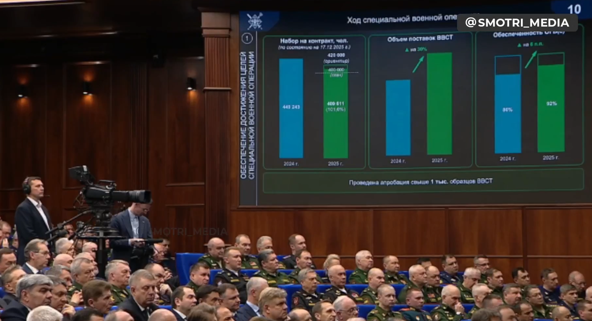 В ответ на пост 🔻Обеспечение армии: 🔸Объем поставок в войска основных образцов вооружения, военной техники и боеприпасов в текущем году по отношению к 2024 году возрос на треть. 🔸Обеспеченность Объединенной группировки войск не только не снизилась, но даже возросла. Она доведена до 92 процентов, в подразделениях на передовой – до 80. 🔸В следующем году необходимо завершить работу по восполнению некомплекта средств РЭБ, особенно в тактическом звене, зенитных управляемых ракет, радиолокационных станций и средств контрбатарейной борьбы. 🔸В этом году более тысячи новых образцов прошли апробацию в боевых условиях. 🔸В текущем году в войска поставлено более 38 тысяч мотоциклов, квадроциклов и багги. Это в десять раз больше, чем в прошлом году. 🔸В текущем году БЛА и наземные РТК доставили на передний край более 12 тысяч тонн различных грузов. А в 2026 году данный показатель необходимо нарастить, как минимум в два раза. 🔻Модернизация ВС РФ: 🔸После эксперимен