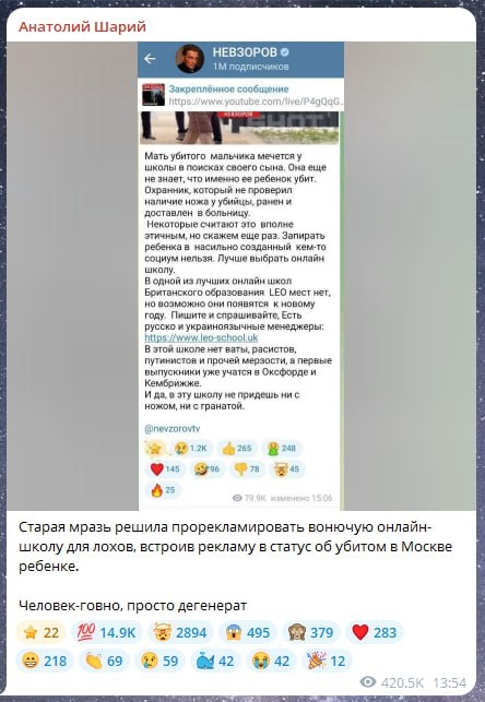 Ему там в комментах накидали большую-пребольшую панаму. Причем его же поклонники, такие же ушибленные, но еще сохранившие, видимо, остатки мозгов. Обращаюсь к ветеранам больницы им. Скворцова-Степанова: "Граждане медики, доценты с кандидатами, как же вы упустили пациента?! Если уж беретесь лечить, надо это делать на совесть. В данном случае начинать надо было с лоботомии!". 🐶 Подпишись на Шарика! Гав!