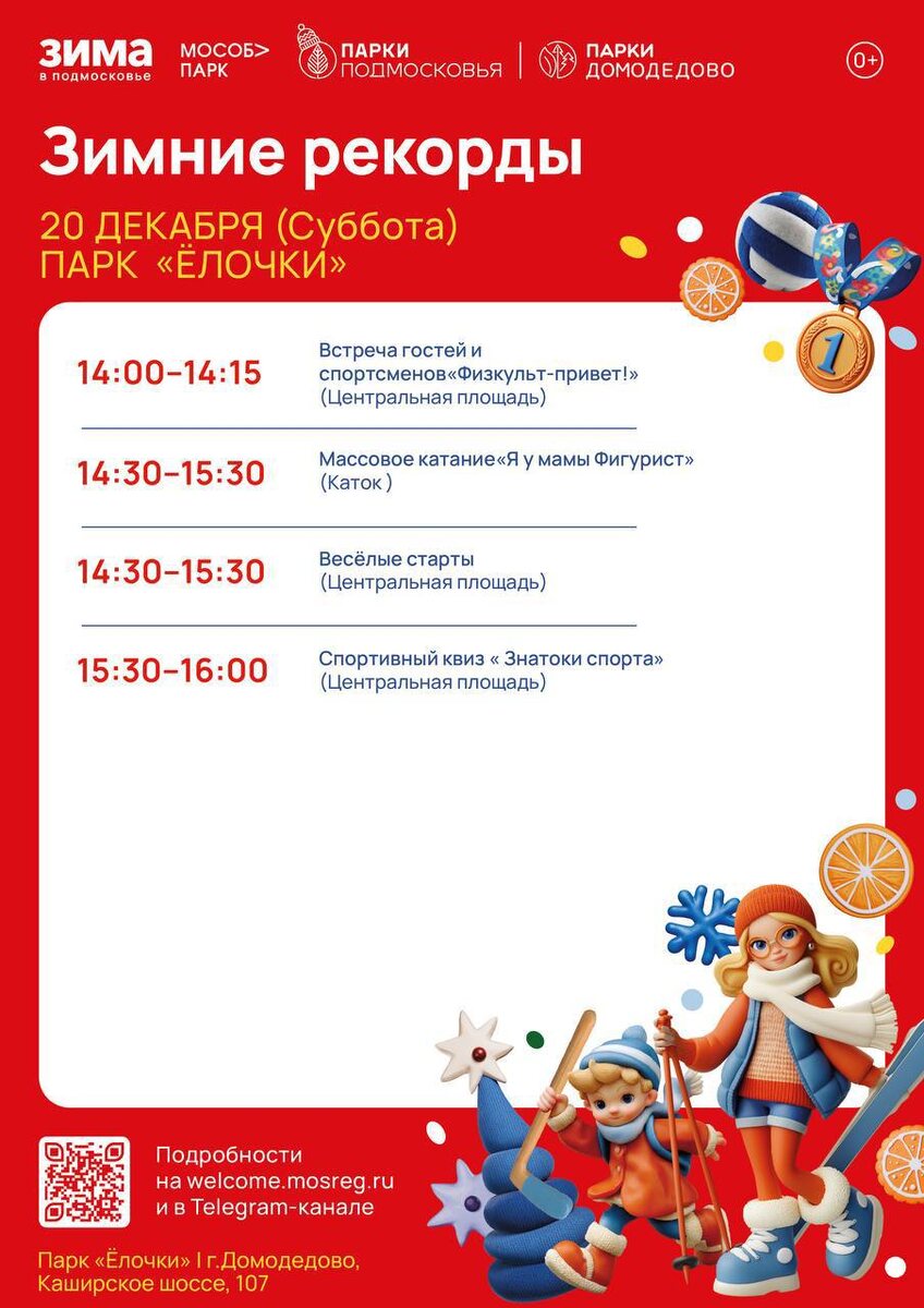 ! В эту субботу вас ожидает: 🔵Зарядка «Физкульт-привет» 🔵Массовый заход по скандинавской ходьбе «Маршрут зимнего вдохновения» 🔵Веселые старты 🔵Массовое катание «Я у самы Фигурист» 🔵Спортивный квиз «Знатоки спорта» 📍парки «Ёлочки» и «Взлёт» 20 декабря #зимавПодмосковье 💜 Подписывайся на наш канал в MAX