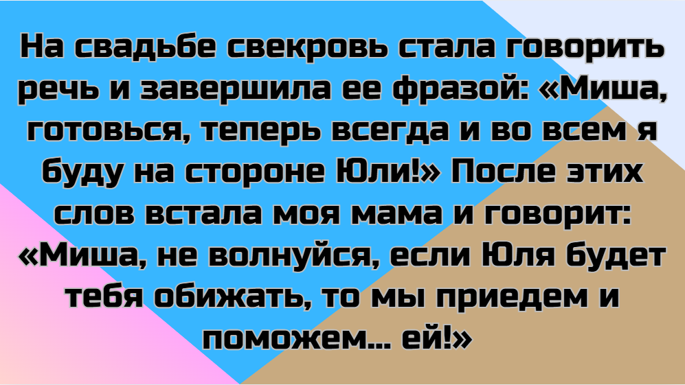 - На свадьбе сына тамада говорит моей снохе: «Смотри, какая у тебя свекровь: и веселая, и красивая, и торты какие вам напекла». А я и отвечаю: «Самое мое лучшее качество ты оценишь потом». Сноха в недоумении переспрашивает, а я ей: «Самое мое лучшее качество, как свекрови, — я далеко живу». Юмор заценила, очень мирно живем.