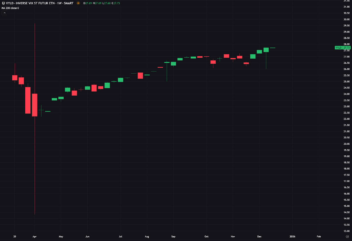 На рынке появился новый инверсный продукт на VIX, который с момента запуска показывает сопоставимую доходность с классическими short-volatility ETF, но при заметно меньших просадках. Речь идёт об Inverse VIX Short-Term Futures ETN ($VYLD), стартовавшем 19.03.2025 г. С момента запуска $VYLD вырос на 10.4%. Для сравнения, ProShares Short VIX Short-Term Futures ETF ($SVXY) за тот же период прибавил 10.2%, Simplify Volatility Premium ETF ($SVOL) - 7.8%, а -1x Short VIX Futures ETF ($SVIX) показал убыток около 1%. Все эти инструменты зарабатывают в среде снижающейся волатильности за счёт короткой позиции по фьючерсам на VIX. Сам индекс VIX, часто называемый «индексом страха», отражает ожидаемую волатильность S&P 500, заложенную в ценах опционов. За последние 35 лет он демонстрировал выраженную склонность к возврату к среднему значению: долгосрочное среднее около 19.5, медиана - примерно 17.6. В спокойных и растущих рынках волатильность, как правило, снижается, а во время распродаж может рез